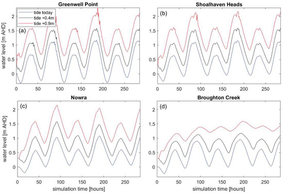 Simulated water levels for spring-tidal conditions and SLR scenarios over 6 tidal cycles at Greenwell Point (a), Shoalhaven Heads (b), Nowra (c), and Broughton Creek (d) in the Shoalhaven Estuary.