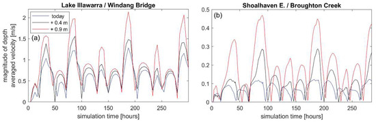 Modelling of depth-averaged current velocities indicated no considerable changes at locations inside the lake, but monitoring in the entrance channel at Windang Bridge (Figure 6a) indicated an increase by 0.3 m/s for SLR of +0.4 m (to 1.6 m/s) and an increase by 0.9 m/s for SLR of +0.9 m (to 2.1 m/s). Furthermore, Figure 6a illustrates the diurnal inequality in the tide and comparatively stronger flood current velocities, which seem to intensify with SLR. Peak current velocities in each scenario simulation correspond to rising tide towards the higher high water of the tidal cycle.