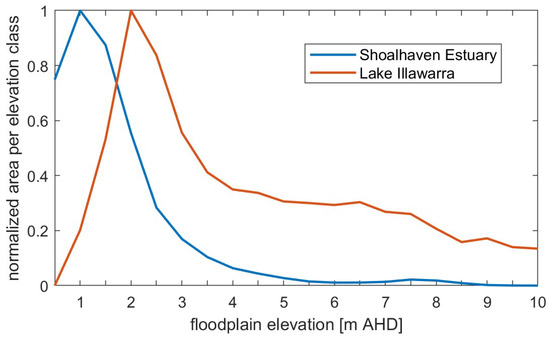 Distribution of estuarine floodplain elevation (0–10 m AHD) for Lake Illawarra and the Shoalhaven Estuary. Floodplain elevation was reclassified to intervals of 0.5 m and the corresponding areas per class normalised to scale the data.