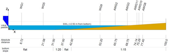 The profile represents a sand beach in the UPC wave flume that has been investigated previously (e.g., [11,35]). In particular, the 1:15 slope of the inner surf and swash zone were deliberately chosen to be far enough from an equilibrium profile, taking into account underlying beach conditions and tested sea states. It is worth noting that the slope represents the theoretical limit between steep and moderate beaches and, therefore, represents a transient swash regime. Such beach slope, moreover, has been investigated by several laboratories [36,37,38,39] and field studies (e.g., [40]).