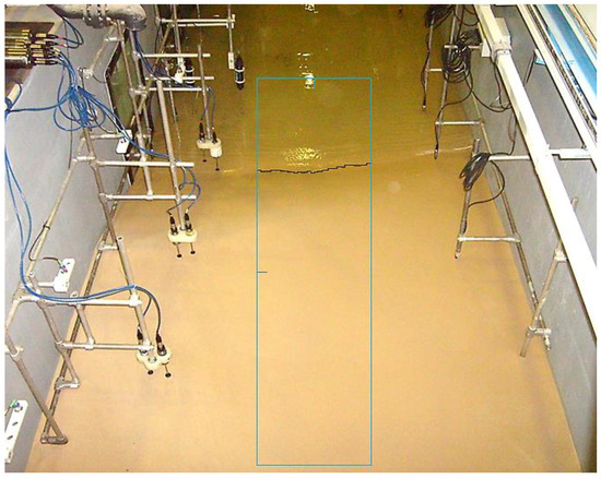 The runup tagging process began from camera calibration phases, by determining the relative position of a minimum of four reference points in the frame. In this study, eight reference points have been considered, in order to define the relative location and orientation of the camera. Target points were the tips of the optical backscatter sensors and the microacoustic wave gauges, the positions of which are known and remain stationary during machining. Once defined in the frame, the coordinates of the frame of reference points, an Image Processing Toolbox™ in MATLAB™ is used to define the relative position of all remaining pixels in the frame (Figure 3), as described by [47,48,49,50]. A particular optical filter of the images was applied in order to bring out the visual differences between dry and wet zones. Then, the relative position of runup along the same cross shore section (the centerline of wave flume) was determined as separation between dry and wet zones.