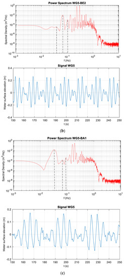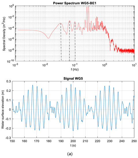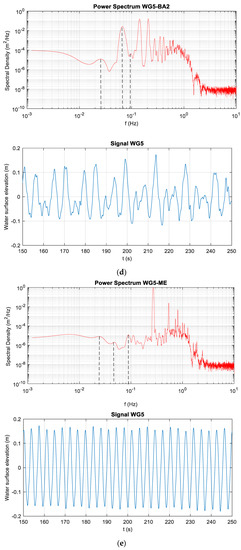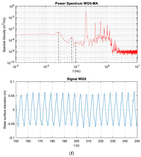 Spectral power density related to the wage gauge WG5 at 21.58 m in the wave flume is presented in Figure 4a,f.