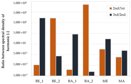 Further considerations can be observed in Figure 5, in which the ratio between spectral density level at different harmonics is shown. In particular, it is noted: