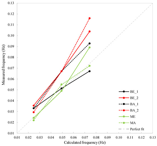 In order to analyze the longest standing waves in the flume, the lowest frequencies are determined and compared with those measured. The wave flume natural frequencies are provided by carrying out the eigenvalue analysis, as in details described by Riefolo et al. [51,52], where different formulas found in the literature were compared. Here, the frequencies calculated with the formula proposed by Merian [43], by referring to the maximum water depth (2.5 m) in the wave flume, are shown in Table 7. The discrepancy between measured and calculated first, second and third modes is graphically represented in Figure 6. For BE_1, ME and MA cases, a good correspondence has been found, for which the influence of wave flume-generated seiching can be definitively upheld. On the other hand, the bichromatic waves with larger bandwidth for both erosive (BE_2) and accretive (BA_2) conditions give different variations from the perfect fit line (grey dot-dashed line), especially at the second and third harmonic.