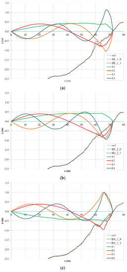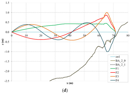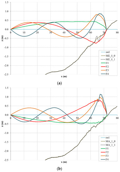Moreover, it is worth noting that the local effect on a beach profile of bichromatic or monochromatic waves can be significantly different due to the interaction of the LFWs that affects the spectra. Considering the typical pattern of modes F1–F4 (according to [45,52]), some differences can be observed in Figure 8. In fact, it is identified: