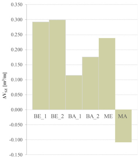 Based on this reasoning, Figure 9 shows the net sediment volume variation in the SZ, and ΔVSZ, approximated as the emerged beach, between the start and end of the test is provided. Such a variation is determined by applying changes in bed elevation between profiles above the SWL.