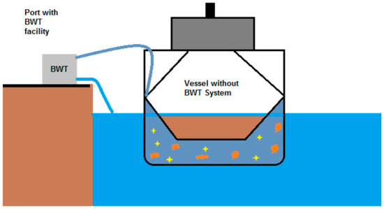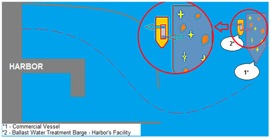 There is the possibility to purchase containers, which can be transported by a trailer at the quays, that require externalized treatment of the ballast water, schematically presented in Figure 3. The advantage of this method is that it is cheaper in terms of the device displacement and even functioning because it will be connected to the power resources of the port. Of course, the initial purchase price is much lower than other solutions. The disadvantage would be the time—being able to condition the cargo operations in a timely manner.