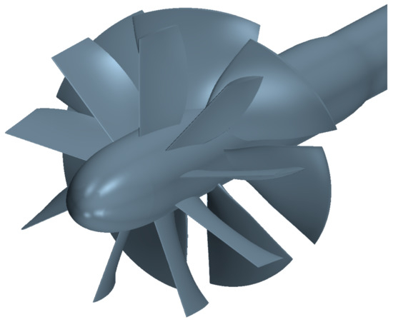 The computational domain for the axial-flow pump. The domain is a circular cylinder bounded by the shroud surface, 16 times the shroud diameter in length. The rotor is located at the longitudinal center of the domain, while the stator is located upstream of the rotor.