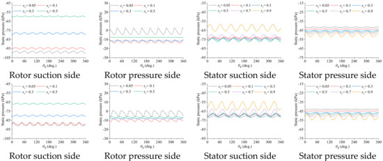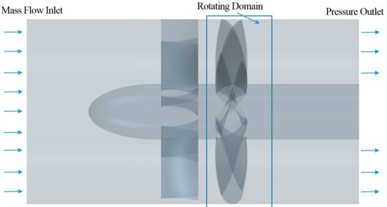 As illustrated in Figure 2, the upstream boundary condition is set as the mass flow inlet, where the flow rate is prescribed; the downstream boundary condition is set as the pressure inlet, where the pressure relative to the reference pressure of the flow domain (atmospheric pressure) is set to zero. All the body surfaces are set as non-slip boundaries. The part of the shroud surface in the rotating sub-domain containing the rotor is set as stationary relative to the fixed coordinate system. At the inlet and the outlet, the turbulence intensity and the turbulent viscosity ratio are set to 2% and 2, respectively.