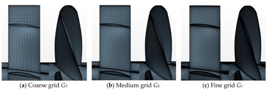 Three sets of successively refined grids are generated with a uniform grid refinement ratio, rG = Δh2/Δh1 = Δh3/Δh2 = , where h3, h2 and h1 denote, respectively, the sizes of coarse grid G3, medium grid G2, and fine grid G1. Figure 5 shows the surface grids for rotor and stator blades. The key parameters of the computational grids are listed in Table 1.