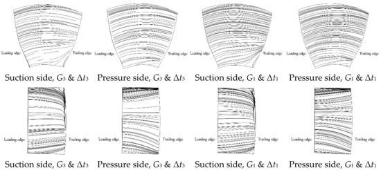 The rotational speed of the rotor is set to 1450 r/min for the three flow rates considered, which is same as that in the model experiments [25]. The Reynolds number based on the relative inflow speed and the chord length at 0.7Rtip is 2.3 × 106, where Rtip is the tip radius of the rotor. The coarse time step size Δt3 is set to 1.1494 × 10−4 s, which corresponds to a blade angular displacement of 1° per time step. The medium and fine time step sizes, Δt2 and Δt1, correspond to 0.5° and 0.25° blade angular displacement per time step, respectively. To resolve the flow in viscous sub-layer, the near-wall grid layers need to satisfy y+ ~ 1. Corresponding to the grid sizes as listed in Table 1, the ranges of surface-averaged y+ are given in Table 2 for the flow rates simulated. Figure 7 shows the limiting streamlines on rotor and stator blade surfaces when Q = 0.42 m3/s. On rotor blade surfaces, flow separation occurs mainly on the suction side, in inner radii and close to the trailing edge. On stator blade surfaces, the flow is converging on the suction side but diverging on the pressure side; flow separation occurs on the suction side only, in close proximity to the trailing edge, and from about 40% span to the tip. It seems that the stator blade geometry may need to be improved. The flow patterns simulated with the coarse grid G3 and the fine grid G1 are quite similar to each other.