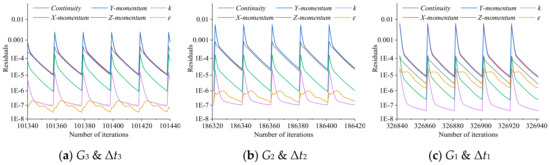 Figure 8 shows an example of the residuals in the last few time steps before convergence. The residual in continuity drops to 10−5–10−6, those in velocity components to 10−5–10−7, and those in k and ε to 10−6–10−8 when the solution converges. The speed of convergence is slow at low flow rates.