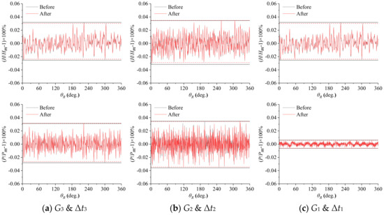 The iteration uncertainty is evaluated by (3) according to the time-domain results in the last revolution of the rotor. Note that, due to the interactions between the rotor and the stator, the simulated unsteady head and power contain the components at a number of frequencies. The interaction components should be removed when evaluating the iteration uncertainty. According to the relation given by Strasberg et al. [26] for contra-rotating propellers, the interaction components exist at the following frequencies: