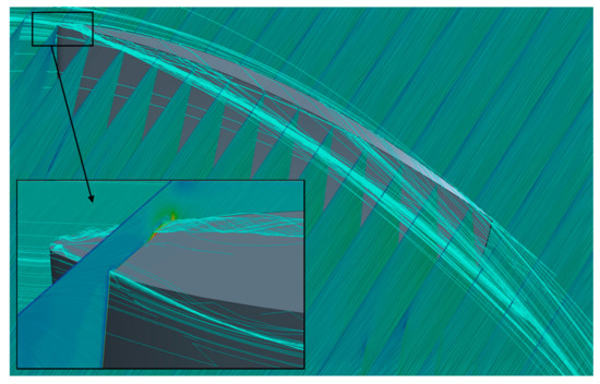 In this section, a detailed investigation is carried out for simulated flow features around rotor blade tips and between the stator and rotor blade rows based on the simulation results with fine grids G1 at the flow rate Q = 0.42 m3/s.