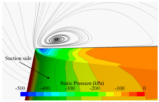 The tip clearance flow is an important factor that influences the cavitation performance of the rotor. Figure 11 shows the streamlines around a blade tip. The flow separates at locations near the leading edge, travels downstream towards the suction side of the blade, and merges together to form the leakage vortices. The flow separation is relatively small at other locations of the tip section. In Figure 12 it is shown that a vortex forms at the leading edge and detaches from the tip surface due to the strong adverse pressure gradients close to the leading edge.
