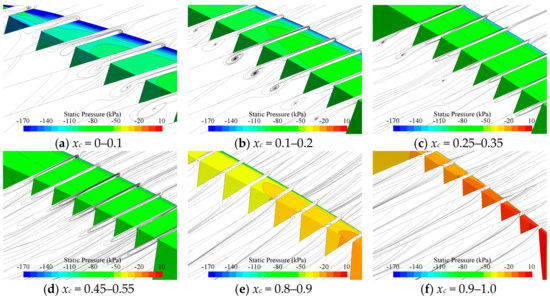 Figure 13 shows in more detail the streamlines in sections across the tip surface. In Figure 13a–c, it is clearly seen that the secondary flow from the pressure side to the suction side of the tip drives the vortical flow that detaches from the vicinity of the leading edge to move towards the suction side as it travels downstream. Meanwhile, the secondary leakage vortices are formed by the separated vortices from the pressure-side corner of the tip at other chordwise locations and travel downstream towards the pressure side of the tip just like the main leakage vortices. The phenomenon of flow separation is evident in the area where there is a large pressure difference between the pressure and suction sides and attenuates gradually behind the mid-chord. The main and secondary leakage vortices may merge at the mid-chord. Finally, they merge near the trailing edge to form a strong vortex. Unlike the open propellers, the tip leakage vortices contract little as they travel downstream.