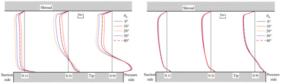 In-plane absolute velocity profiles in the tip clearance at 10% (left) and 50% (right) chord length. The velocity profiles shown at five instantaneous positions of the rotor θR cover the angular spacing between adjacent stator blades. From suction side to pressure side, three sections are taken at 10%, 50% and 90% of the local thickness t, respectively. The velocity magnitude is zero at the vertical straight lines. The shroud is stationary. The rotor tip rotates from left to right. Q = 0.42 m3/s.