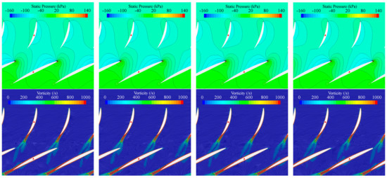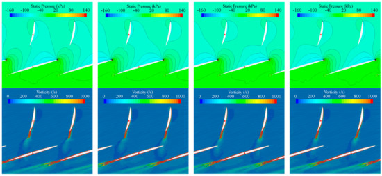 The pressure (top row) and vorticity (bottom row) around stator and rotor blade sections at 0.7Rtip. The rotor blade angle θR = 0°, 10°, 20°, 30° (from left to right). Q = 0.42 m3/s.