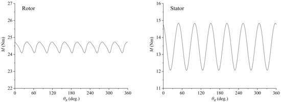 Oscillations of the torques on a rotor blade (left) and a stator blade (right). θR denotes the angular position of the rotor blade. Q = 0.42 m3/s.