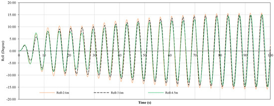 The dimensionless damping coefficients of the model in different conditions are presented in Table 5. The damping coefficients were extracted from roll motion characteristics based on Equation (11) and were converted into a dimensionless number, which was recommended by the ITTC [25]. The model was free up to 3DOF and was excited at frequencies higher and lower than the natural frequency. Hence, the maximum roll motion characteristics were decreased compared to 6DOF at resonance conditions. That is because the total moment of inertia (IN) and restoring moment (RE) cannot counteract each other completely. The restoring moment was calculated by Autohydro software and the virtual moment of inertia was calculated based on [37]. The roll exciting moment compensates the difference between these two. Therefore, the amplitude of the real roll exciting moment decreases during a cycle.