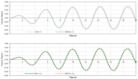 Angular roll velocity (Vel.) time trace of the model under 20 Nm exciting moment at frequency of 1.4 rad/s, Fn = 0, Fn = 0.1, Fn = 0.19 and considering different degrees of freedom. Roll, heave and pitch motions are shown by R, H and P, respectively.