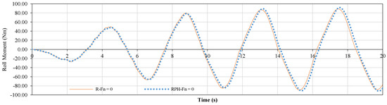 Total roll moment (Mtot) time trace of the model under 20 Nm exciting moment at frequency of 1.4 rad/s, Fn = 0, Fn = 0.1, Fn = 0.19 and considering different degrees of freedom. Roll, heave and pitch motions are shown by R, H and P, respectively.