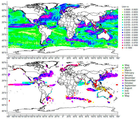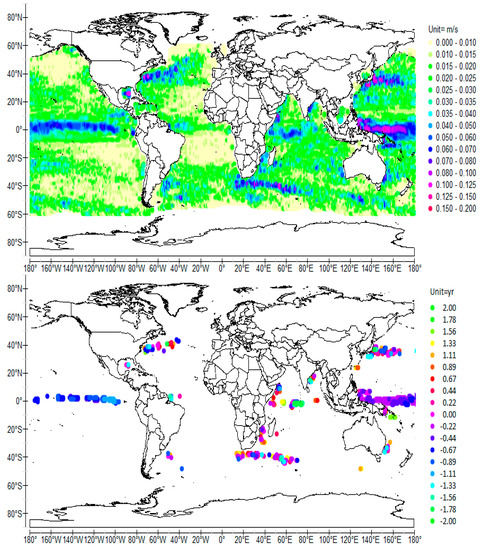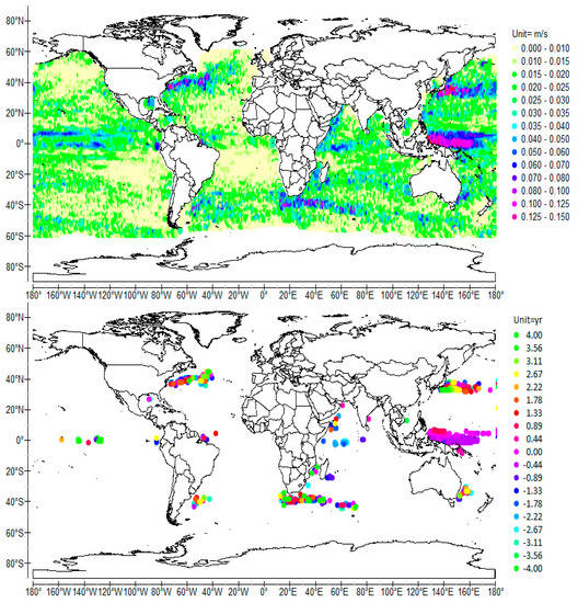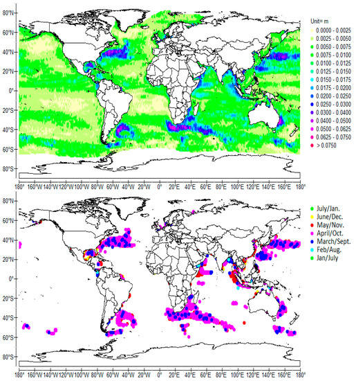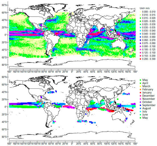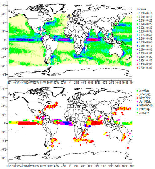 Normalized cross-wavelet power (top) and coherence phase (bottom) of the signed magnitude ±v of Surface Current Velocity (SCV) scale-averaged over 8–16 months (1-year average period), time-averaged over 1992–2009, gridded with a 1 × 1° resolution. The phase refers to the time when the modulated current velocity reaches its maximum to the east. The maximum velocity to the west is reached T/2 later. Data are provided by the NOAA (National Oceanic and Atmospheric Administration): www.oscar.noaa.gov/datadisplay/datadownload.htm.