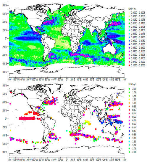 Normalized cross-wavelet power (top) and coherence phase (bottom) of SSH and –SOI (used as the temporal reference) scale-averaged over 3.5–4.5 years (4-year average period), time-averaged over 1992–2009. –SOI, the opposite of the Southern Oscillation Index (SOI), turns out to be nearly in phase with SSH, the signed magnitude ±v of SCV at 4, 8 and longer periods across much of the oceans. So, the use of –SOI instead of SOI makes easier the interpretation of the coherence phase. The central value of the phase (shift = 0 year) corresponds to 03/2002 (or 03/2006, …). The monthly SOI is provided by the National Centre for Atmospheric Research: http://www.cgd.ucar.edu/cas/catalog/climind/soi.html.