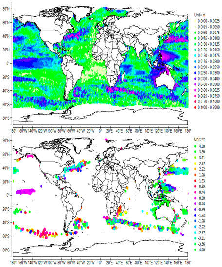 The spatial representation of the Wavelet analysis of the SSH and the Surface Current Velocity (SCV) series allows representing the regions subject to this oscillation phenomenon when the wavelet power is scale-averaged over a relevant band. Here a continuous Morlet wavelet transform is used so that the period and the scale coincide [17,31]. In addition to the wavelet power, it is often necessary to specify the phase that expresses when the oscillation reaches its extrema with respect to a temporal reference. Taking for example the SSH, the cross-wavelet analysis of SSH and the temporal reference (TR) shows the cross-wavelet power and the coherence phase. The cross-wavelet power of SSH and TR divided by the square root of the wavelet power of TR, that is, the normalized cross-wavelet power, coincides with the square root of the wavelet power of SSH. The latter is the amplitude of the SSH oscillation. The coherence phase of SSH and TR shows the time shift between the SSH oscillation and the TR.