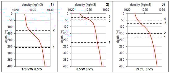 Profiles of density considered as representative of equatorial oceans to determine the depth of the interfaces associated with normal modes for the Pacific (1), the Atlantic (2) and the Indian (3) Oceans. Interfaces associated with the first baroclinic modes are determined so that phase speeds are close to those observed, that is, 2.8, 2.35 and 2.3 m/s, respectively. Interfaces associated with the highest modes are positioned at the top of the pycnoclines: the lowest phase speeds allow explaining satisfactorily the resonance of 4- and 8-year period RFWs in the Indian and Atlantic oceans, respectively (one-eighth of the speed corresponding to the first mode). However, the resonance of a 4-year period RFW in the Atlantic and 1- and 2-year period RFWs in the Indian oceans that contribute to the Indian Ocean Dipole (IOD) suggests the existence of intermediate interfaces located within the pycnocline (their location is approximate). Data are provided by the NOAA (National Oceanic and Atmospheric Administration): http://iridl.ldeo.columbia.edu/expert/SOURCES/LEVITUS94/oceanviews2.html.