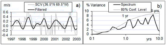 (a) SCV (eastward) unfiltered and filtered with a bandpass filter within the 8–16 month band; (b) Fourier power spectrum of SCV from 1992 to 2009 and confidence spectrum assuming a red-noise with a lag-1 autocorrelation α = 0.46.
