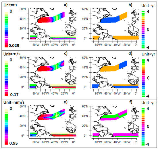 The solution of the equations of motion in the North Atlantic for the 8-year period Resonantly Forced Waves (RFW) supposing the wind-driven circulation velocity is 0.038 m/s [19]. Represented are the wavelet power (on the left) and the coherence phase (on the right) of the perturbation η of SSH (a,b), the zonal modulated current velocity (c,d), the phase refers to the modulated currents flowing eastward (the wind-driven circulation is ignored) and the meridional modulated current velocity (e,f) (the phase refers to the modulated currents flowing northward). Only the equatorial waves are represented in the tropical ocean: the interface associated with the vertical baroclinic mode is at the top of the pycnocline (the highest mode n = 3 for the Atlantic). First baroclinic mode Rossby waves occur at mid-latitudes: the mean depth of the thermocline is supposed to be 60 m, the density of the mixed layer 1025 kg/m3. The changes in density are small because excess salinity where evaporation occurs is the most important, which is to say the neighboring latitudes of 10° N or S, are offset by the thermal expansion of warm waters. Around the gyres the approximation is made that where and are the density of the upper and the lower layer, respectively. The ratio μ = η/∆h is taken to 0.0025 (∆h is the amplitude of the vertical motion of the interface). The length of partial sums of Fourier series is 24 versus both the longitude and the time. The decay rate of friction r = αω is 2.5 × 10−9 s−1 (α = 0.1): ω = 2π⁄T, T = 8 years for Rossby waves and 1.7 × 10−9 s−1 (α = 0.017), T = 0.5 year for Kelvin waves. The time of transfer of warm water from the equator to mid-latitudes is neglected, being small in comparison with the period.