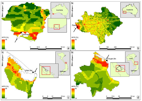 Human footprint index (HFPI) of the four systems considered; (a) Wilson Inlet system, Australia; (b) Swan River system, Australia; (c) Tu Hien Inlet system, Vietnam and (d) Thuan An Inlet system, Vietnam. Arrows indicate the locations of the inlets.