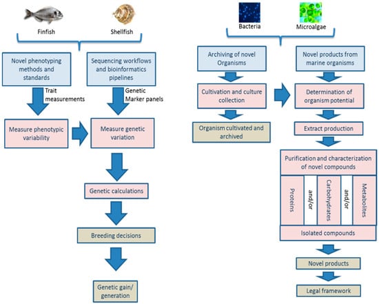 This research infrastructure approach is particularly attractive for specialized research centres, such as marine stations, that, although highly skilled in their field of expertise, may lack the know-how to perform the downstream experiments that are indispensable for translating basic research findings into molecular tools and marketable products. The Horizon 2020 EU-funded European Marine Biological Research Infrastructure Cluster (EMBRIC) emerged in 2015 in order to close this gap and boost translational research. The EMBRIC cluster aims to build a dynamic network of partners from established and emerging research infrastructures to advance the field of marine biotechnology. The EMBRIC project includes experimental pilot projects focusing on two specific sectors of marine biotechnology: (i) aquaculture genetics and breeding, and (ii) discovery and exploitation of marine natural products from microalgae and marine microbes (Figure 1). A total of 29 scientific partners (i.e., universities, research institutes, non-profit organizations, and SMEs), most of which are also members of a European Research Infrastructure, have joined forces and generated a comprehensive map of all resources available within the EMBRIC network with the ultimate goal to make those resources (i.e., facilities, technologies, marine organisms, data, and experimental know-how) broadly accessible to the scientific community (see http://www.embric.eu/).