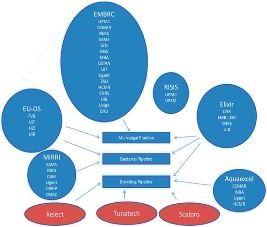 More than half of all seafood consumption is now met from aquaculture following rising demand from a growing and increasingly affluent world population and stagnation of traditional capture fisheries due to over exploitation of stocks. It is estimated that by 2030, 93.6 million tons of seafood per year will be produced from aquaculture, almost twice as much as in 2008 [11]. In contrast, aquaculture production within the European Union has been static for more than a decade. Aquaculture is becoming highly industrialized, requiring innovative technological solutions to solve production bottlenecks. Major challenges include the provision of sustainably sourced feed supplies, the availability of suitable production sites, and disease and welfare issues. Part of the answer to these global challenges lies in increasing production efficiency, not least through the adoption of modern approaches to breeding and broodstock genetics to improve growth feed conversion efficiency, disease resistance, and flesh quality of farmed species [12]. EMBRIC is well placed to play an important role in supporting the uptake of modern genetics in breeding programs because of the scale of its research capabilities in ‘omics’ techniques (EMBRC and MIRRI), bioinformatics (ELIXIR), and aquaculture (AQUAEXCEL2020). This case study represents a pilot in the field of aquaculture genetics providing a common entry point to all three Research Infrastructures involved through partners in the United Kingdom (USTAN, Marine Science Scotland), France (French National Institute for Agricultural Research (INRA)), Greece (Hellenic Centre for Marine Research), and Norway (University of Bergen). The development of sophisticated genetic tools and the high-level skill sets in quantitative genetics and bioinformatics (Figure 1) needed to implement genetic selection is beyond the capacity of most of the companies in a highly-fragmented aquaculture sector, particularly small- and medium-sized enterprises. Innovation in aquaculture genetics is dependent on the academic sector and a relatively restricted range of specialist genetic companies. To ensure that the activities of this case study are relevant to the needs of industry, three SMEs have been included as partners (Figure 2), Scalpro A/S (a Norwegian producer of scallop and oyster spat), Tunatech GmbH (an innovative German aquaculture company), and Xelect Ltd. (a leading aquaculture genetics service company based in Scotland).