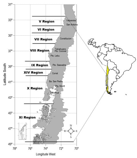 The biological data derives from weekly routine sampling carried out by the Instituto de Fomento Pesquero (IFOP) as part of the Project “Monitoring of the Main Central-South Pelagic Fisheries” (10–14 LS), from 2001 to 2015, in the ports of San Antonio (V. Region), Talcahuano, San Vicente, Lota and Coronel (VIII. Region), Valdivia (IX. Region) and Corral (XIV. Region), as shown in Figure 1. Biological data comprises lengths of sampled individuals, with corresponding year (2001–2015) and week (from 2 to 53 as the first week of observations appears as week 53).