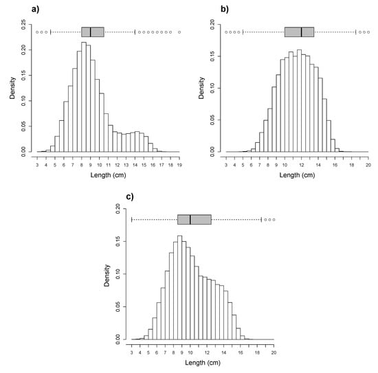 Boxplots and histograms of lengths of (a) V.–VIII., (b) IX.–XIV., and (c) V.–XIV. Regions and period 2001–2015.