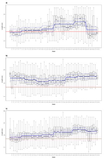 The V.–VIII. Region area (Figure 3a) has a strong juvenile component during the first quarter, coinciding with the segmented line of 8.5 cm LT, reporting the important contribution of juveniles produced during this period. Conversely, in the sub-zones of the IX.–XIV. Regions (Figure 3b) the median ones move away and exceed the reference size, which may suggest a movement of juveniles from the V.–VIII. Regions to the south. This movement generates a time lag that contributes to increase fish abundance in the southern zone. This decline in juvenile specimens may also be related to fishing and local environmental conditions, as it is known that local recruitment processes occur and are evaluated annually by acoustic methods (see [20]). With respect to the macro-zone (V.–XIV. Regions) it was observed that in the first 23 weeks approximately until late May, normally a period of extensive recruitment or entry of juveniles due to their condition as partial spawners, mean sizes fluctuated around or near 8.5 cm, and subsequently an upward trend of these averages set in (Figure 3c).