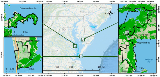 The Chesapeake Bay is located within the Mid-Atlantic regions of the east coast of the US (Figure 1). The Bay is surrounded by the coastal counties of Maryland (MD) and Virginia (VA), which has been identified as one of the “hot spot” coasts for SLR [43]. In addition, the bay areas are experiencing a higher rate of land subsidence than the accretion rate (Boon, 2010). The lower accretion rate in the Bay areas can exacerbate the impacts for wetlands and marshes that are located in the low-lying coastal landscape. A study by Beckett et al. [44] used surface elevation and accretion measurements in freshwater and brackish marshes in the Nanticoke estuary of the Chesapeake Bay and demonstrated that, on average, the wetland elevation has decreased by 1.8 ± 2.7 mmyr−1, which is at least 5 mmyr−1 below the rate at which global sea level is rising. Recent studies also suggest that due to SLR, Virginia can lose about 50% to 80% of its wetlands [45]. Additionally, a 0.92 m (3 ft.) rise in sea level can affect about 25.2% of the protected areas in Virginia and 24.3% in Maryland [32].
