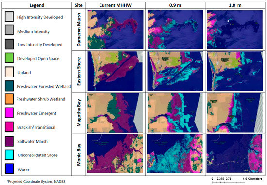 Additionally, Figure 2 demonstrates the projected land cover changes in the selected preserve areas due to marsh migration. The third column in Figure 2 shows the current land cover in the protected areas while the fourth and fifth columns show the projected land cover changes due to the “low” and “highest” SLR scenarios. It can be seen from the last two columns that with SLR, the existing salt-water marshes in the protected areas will either submerge into open water or convert to unconsolidated shore. For example, the second row on Figure 2 displays that with a 1.83 m (6 ft.) of SLR, the existing saltwater marshes in Dameron Marsh will submerge in the open water, while the freshwater wetlands can convert to brackish or transitional marshes. The current land use and land cover information is collected from NOAA’s Coastal Change Analysis Program (C-CAP) [53]. The details of different land cover types can also be found from the C-CAP database.