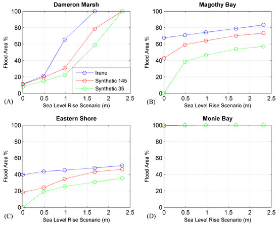 Figure 8 and Figure 9 show that, regardless of the storm, almost 100% of Monie Bay land area is inundated by storm surge. In terms of increase in flood extent, results indicate that Dameron Marsh is the most sensitive preserve area to SLR. The average percent of storm surge flooded area in Dameron Marsh increases rapidly, as the rate of SLR increases while for Magothy Bay and Eastern Shore the flooded area gradually expands with the increases in SLR. This reflects the uniqueness of the coastal protected areas in terms of their location and topography. For example, the nearshore elevation at both Eastern Shore and Magothy Bay are around 0–2 m which rises up to an average 2–5 m in areas further inland. Therefore, even in the “highest” SLR scenario with an average maximum water elevation of 3–3.5 m, both preserve areas are not entirely inundated (Figure 8). In contrast, Dameron Marsh and Monie Bay have a relatively flat and constant slope, ranging between 0–2 m within the preserve areas. Thus, a “maximum” of 3 m height of flooding inundates the entire preserve areas. This higher exposure to coastal flooding in these preserve areas can consequently reduce the plant growth and organic matter input that decreases with excess inundation [20]. Our findings suggest that the increase in flooding extent inside the preserves is not linearly related to SLR. A study by Li et al. [74] (2012) in Norfolk, Virginia, also found a nonlinear relationship where a 50-year storm with 1 and 2 m SLR increased total inundated area 34% and 69%, respectively, that changed to 74% and 78% when analyzed for a 100-year storm for same SLR rates. Another study in the Galveston Bay and Jefferson County, Texas, found that the SLR and changing landscapes inundated three times more land when increasing from 0.402 m to 0.926 m [15]. However, the results demonstrated a linear relationship between surge induced water elevation in the protected areas with SLR. These results differ from Bilskie et al. [13], where for coastal areas in Alabama and Mississippi, they found that the increase in water levels was greater than the amount of water added due to SLR. It should be noted, that the focus of our study is on four coastal preserve areas that are spatially very small in compared to the coastal areas studied by Bilskie et al. [13]. These findings suggest that the preserves sizes are not large enough to allow for a fully developed interaction between storm surge hydrodynamics and friction; thus, the long wave associated to the storm surge is not significantly affected within these spatial scales, as observed by Bilskie et al. [13] in the much larger marshes of the Louisiana coast.