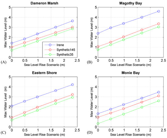 The results showed that the hydrodynamic responses inside the preserve area to storm surge, SLR, and marsh migration are site-specific. Therefore, in this section, the findings are summarized to contextualize the results for a regional scale and provide an overall understanding on the impacts of our results in coastal protected areas. Our results indicate that storm intensity plays a significant role in inundation, maximum water levels, and wave heights in the protected areas. The highest intensity storm, Irene, showed higher impacts on the study sites. Figure 8 shows the inundation area and the maximum water levels under different rates of SLR for hurricane Irene in the four preserve areas. The inundation maps in Figure 8 also indicates that the “highest” SLR can raise inundation height in the protected areas to an average of 3.5 to 5 m which is almost 1.5 to 2.5 m higher than the current day flood elevation. The study by Xia et al. (2008) [73] also found out the significance of storm track and intensity in storm surge inundation.