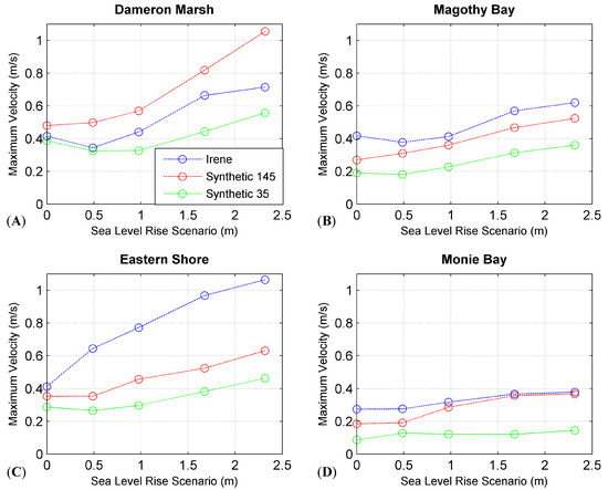Maximum currents velocities at each preserve areas for current condition and different SLR scenarios. The top panel shows the simulated maximum currents velocity in (A) Dameron Marsh and (B) Magothy Bay. In the bottom panel results are shown for (C) Eastern Shore and (D) Monie Bay Preserve Area.