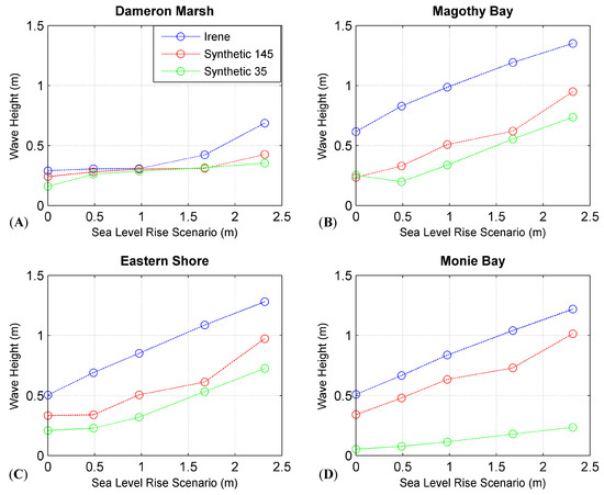 Furthermore, except for Dameron Marsh, SLR significantly increases the wave heights in the preserve areas. For instance, in Eastern Shore and Magothy Bay, a 0.97 m of SLR during hurricane Irene increases the maximum wave heights by 0.5 m, which is almost a 100% increase from the current conditions. For Dameron Marsh, until the “highest” scenario, no significant increase in wave heights is found with SLR. However, in the rest of the preserve areas, the current wave heights due to storm surge are considerably higher than Dameron Marsh. This indicates that preserve areas with higher wave heights without any SLR will have higher rate of increase due to SLR than the ones with lower wave impacts currently. Additionally, the “highest” SLR scenario leads to more than 100% increase in maximum wave heights from the current conditions during any storm events. For example, depending on the storms, a 2.3 m of SLR can increase the maximum wave heights in Monie Bay from a range of 0.05–0.5 m to 0.25–1.2 m. Detailed wave heights in the protected areas for the selected storms and scenarios are provided in Table A5.