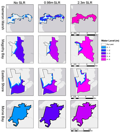 Both ocean water level records and satellite altimetry from the last century indicate a rise in global sea level [1,2,3,4]. In the next century sea level is expected to rise at a greater rate than during the past 50 years [5]. The Fifth Assessment Report (AR5) of the Intergovernmental Panel on Climate Change (IPCC) projected that from 1986–2005 to 2081–2100, the global mean sea level will rise by 0.26–0.55 m and by 0.45–0.82 m respectively, under the lowest (RCP2.6) and highest greenhouse-gas concentration scenarios (RCP8.5) [1]. The potential rise in sea level can largely affect coastal ecosystems through increased flooding, salinity, erosion, and loss of wetlands [6]. Although the loss of coastal wetlands can occur from various reasons [7], studies suggests that sea level rise (SLR) can reduce 22% of the world’s coastal wetlands by the 2080s [8,9]. It is also estimated that 66% of coastal wetlands in 76 developing countries are at risk considering 1 m of SLR in the future [7]. Additionally, with projected hurricane intensification over the next century [10,11], the combined effects of storm surge and SLR are likely to increase flood impacts in coastal areas [12].