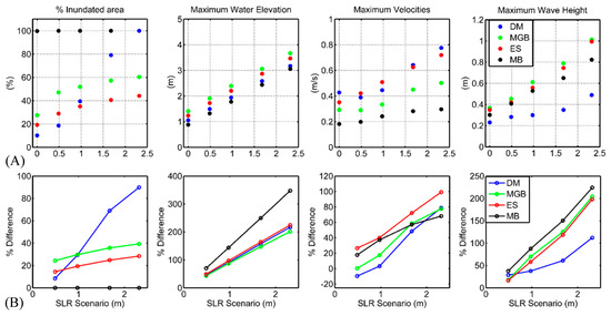 In order to estimate the flooding extent in the protected areas, the percentage-flooded area due to the selected storms is plotted in Figure 4. The plot for each site shows the percent of inundated area due to storm surge for the current condition and different SLR scenarios. The zero SLR value in the x-axis of the plots represents the current condition.