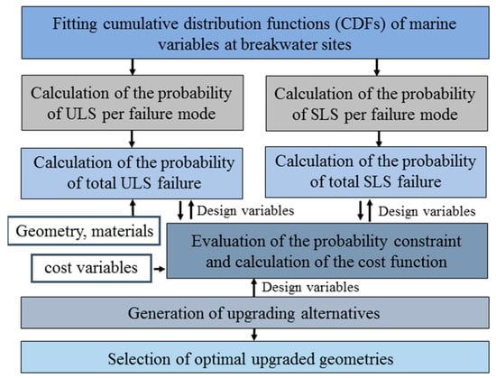 The analysis begins with the determination of limit state functions and the description of CDFs of variables in these functions. For port/harbor structures both ULS and SLS are examined. A reliability-based optimized breakwater geometry results from minimizing the total costs (adding upgrading and possible costs of failure) during the service lifetime of each upgraded geometry of the breakwater. Failure costs are estimated considering the failure probability for each type of upgraded geometry of the breakwater within its service lifetime.
