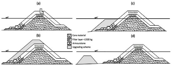 Sketch portrayal of four basic upgrading conceptual options of a rubble mound breakwater used for mitigation against climate change: (a) crown wall or heightening of existing crest element; (b) additional protective armor layer; (c) additional berm on the seaside breakwater slope; (d) low-crested structure in front of existing breakwater.