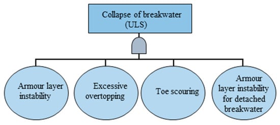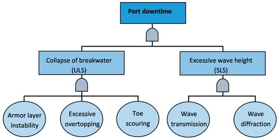 A rubble mound breakwater usually consists of many parts, such as the core, the armor layers (underlayers and cover layer), the concrete cap and/or crown wall on the crest, and the toe structure. Failure of each one of them under extreme marine conditions can cause malfunction of the entire structure. Only principle failure modes are considered here as the main types of instability under extreme marine climate conditions (ULS), namely instability of the seaside primary armor layer, excessive wave overtopping, and scouring of the breakwater toe. The wave height inside the protected basins in the SLS will be considered as a combination of wave refraction-diffraction via the entrance of the protective system and wave transmission through and overtopping the breakwaters []. Figure 3 presents the fault tree corresponding to the port downtime “top event”.