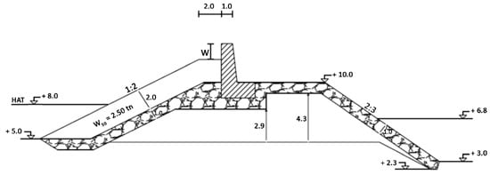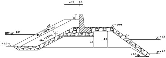 Hydraulic stability of the seaside primary armor layer of a rubble mound breakwater can also be assessed by means of the semi-empirical formulas of van der Meer [] for plunging and surging type breaking conditions for rock structures. The formula corresponding to the former conditions is given below: